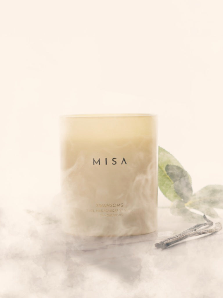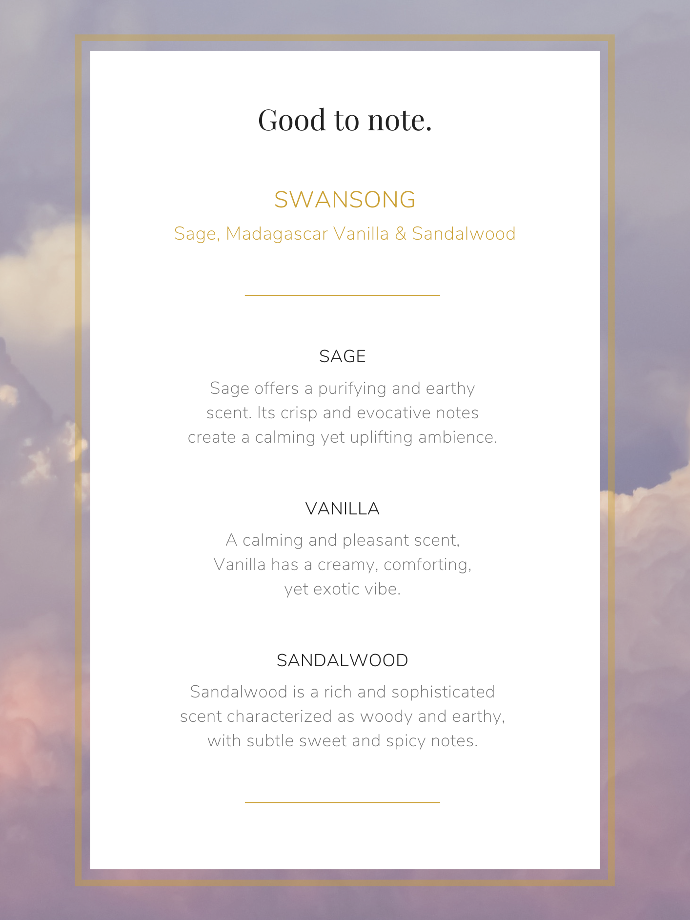 Revisit that heady feeling of your best days with Swansong. This tranquil scented candle uplifts and grounds you at the same time, with its comforting notes of Sage, Madagascar Vanilla and Sandalwood.