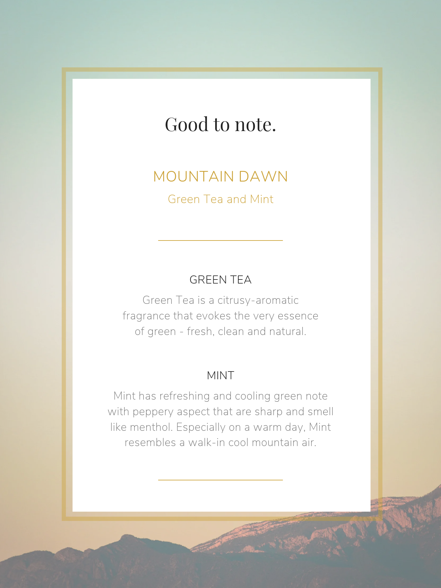 The night sky gives way to dawn and the first rays of the sun caress the mountain top. Experience a sprightly new day with crisp notes of Green Tea and Mint at the very heart of this cheery candle.
