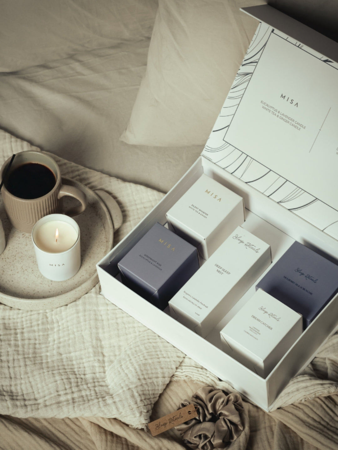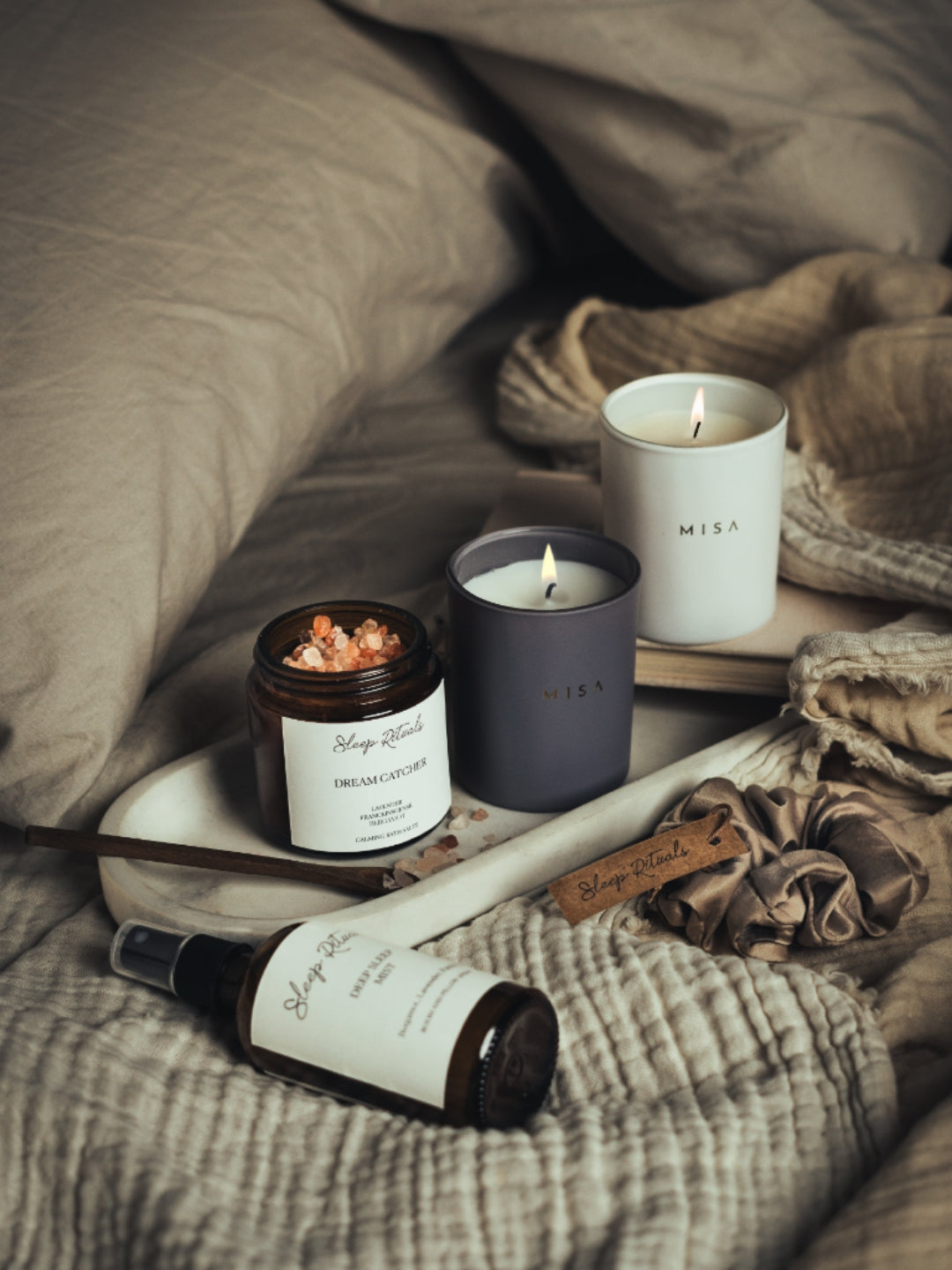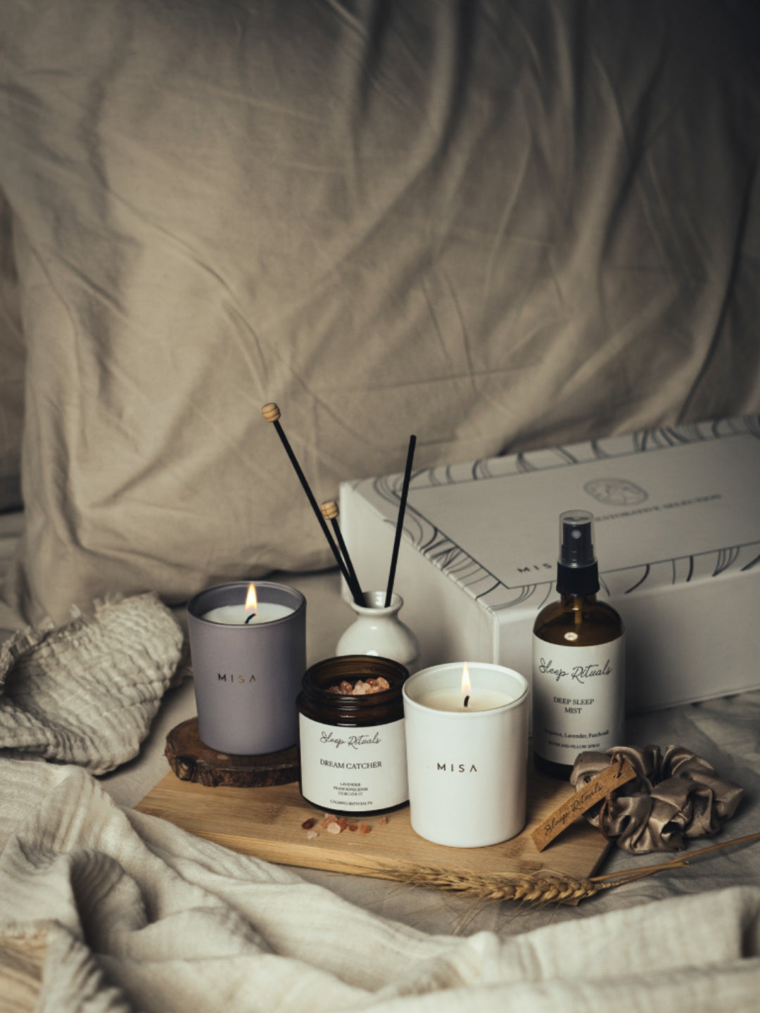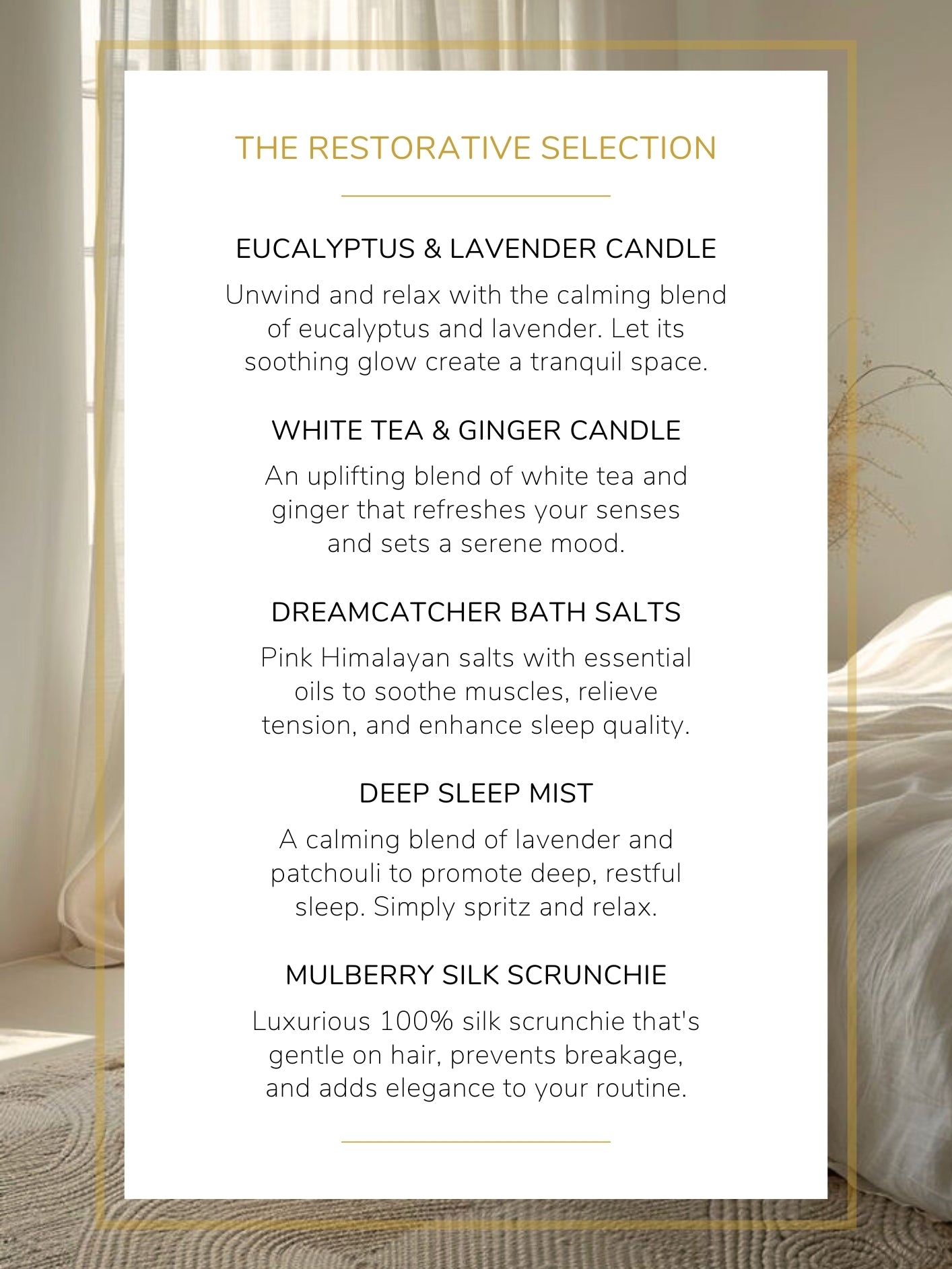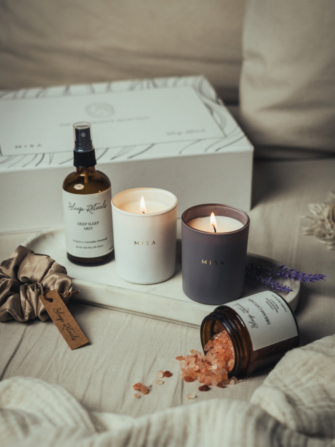 Set the tone for restful nights with The Restorative Selection - a thoughtfully curated set by MISA and Sleep Rituals. Featuring calming candles, soothing bath salts, a luxurious silk scrunchie, and a relaxing mist, this collection transforms your bedtime into quiet indulgence. Because sleep deserves its own ritual.