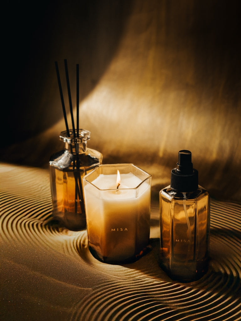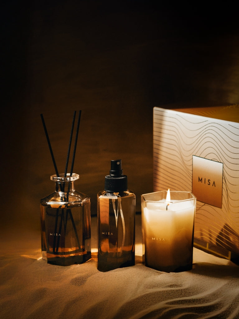 Zephyr is imagined as a three-part harmony — candle, reed diffuser and a room spray that quiets the mind. Each set is crafted to anchor moments of stillness and warmth, whether you’re winding down the day or setting the tone for unhurried hours.